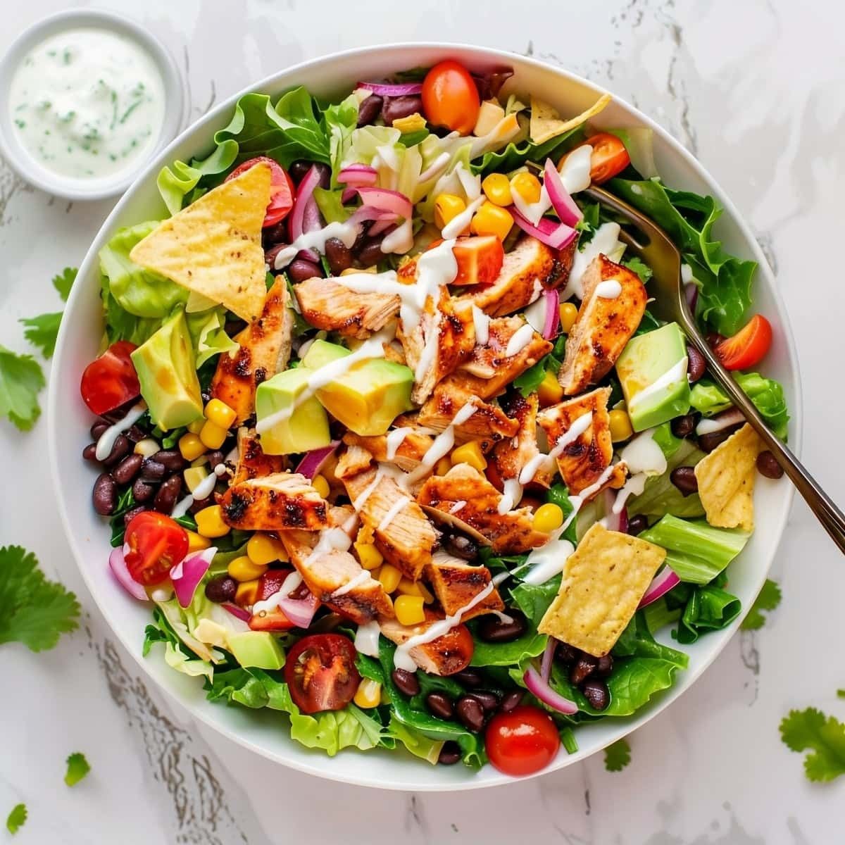 - Schritt 6: Dressing und finale Zubereitung Das vorbereitete Cilantro-Lime-Dressing über den gesamten Salat träufeln. Mit zwei großen Löffeln vorsichtig aber gründlich vermischen, sodass alle Zutaten gleichmäßig mit dem Dressing überzogen werden. Mit frischen Korianderblättern bestreuen und zerbröselte Tortilla-Chips als Topping hinzufügen.