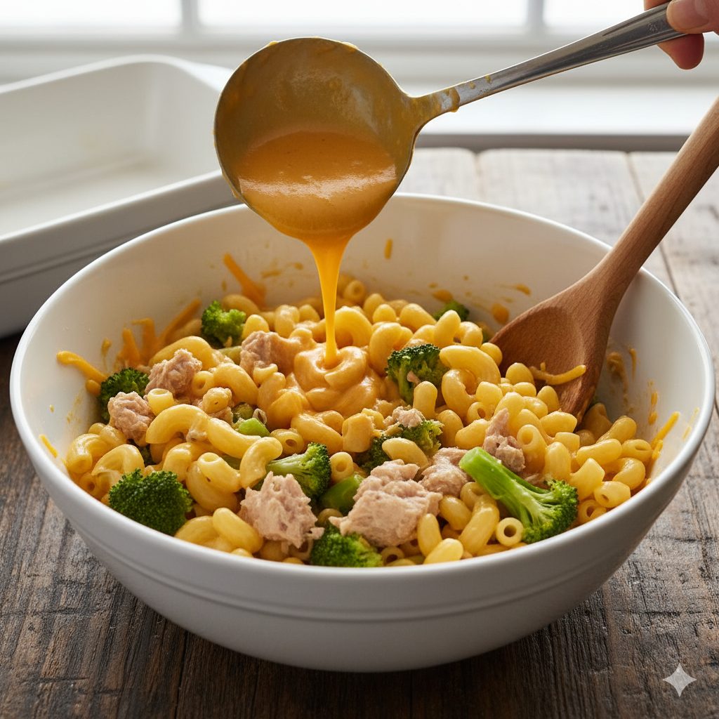 - Die Füllung Mischen und Abschmecken: Den geriebenen Käse (200 g) zur Béchamelsauce geben und unter Rühren schmelzen lassen, bis eine glatte, glänzende Käsesauce entsteht. Nun die abgegossenen Makkaroni und den Brokkoli vorsichtig in die Käsesauce geben. Zuletzt den abgetropften Thunfisch locker unterheben, ohne ihn zu sehr zu zerdrücken. Die gesamte Masse in die vorbereitete Auflaufform füllen.
